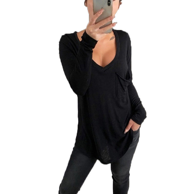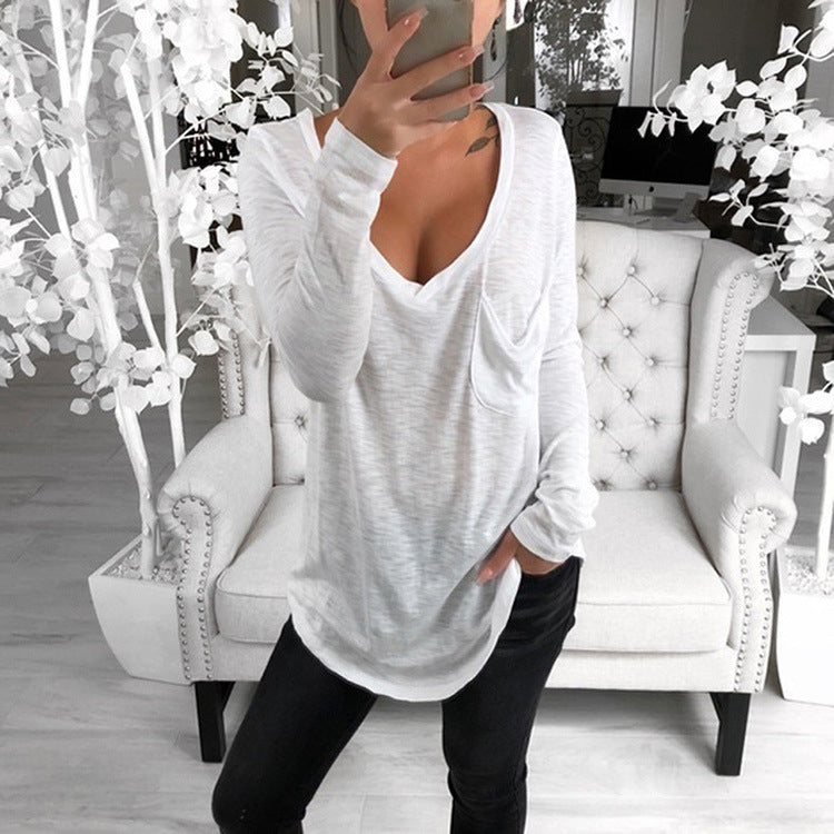 Sexy V-neck loose pocket long sleeve T-shirt
