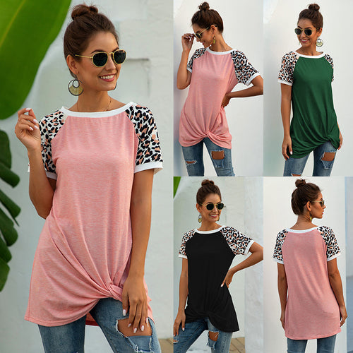 Round neck leopard stitching twisted short-sleeved T-shirt