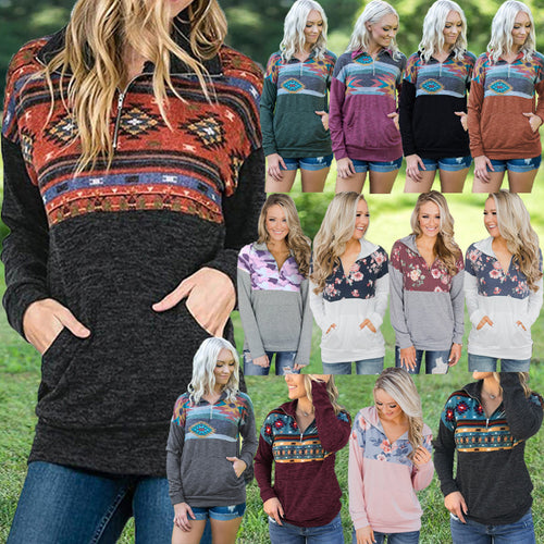 Fashion print zipper pocket long sleeve women's Top