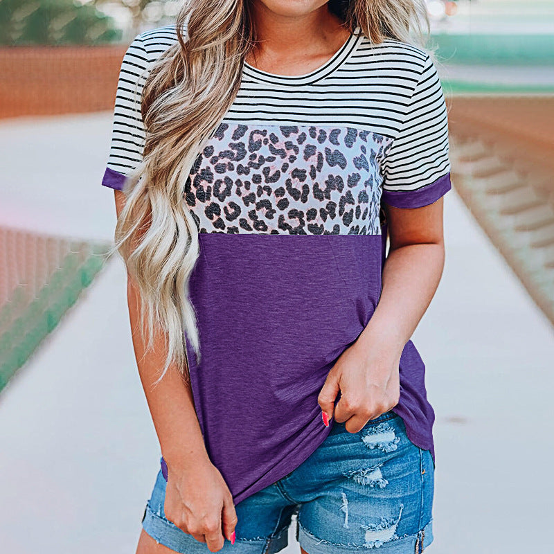 Women's round neck striped leopard print contrast short-sleeved T-shirt